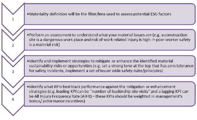 4.9 In assessing materiality of the ESG factors on which it reports, the issuer should first satisfy itself of the relevance of selected factors to its business strategy and outcomes. This has the benefit of focusing both executives and employees on uniform key risks and opportunities that deliver (or impede) desired outcomes.